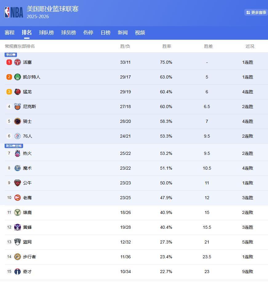 热火、魔术、公牛、老鹰处于附加赛区间,雄鹿18胜26负排名东部第11,按他们的表现,附加赛基本也进不去了,而篮网近来打的非常不错,战绩提升的很快,有打进附加赛的可能!