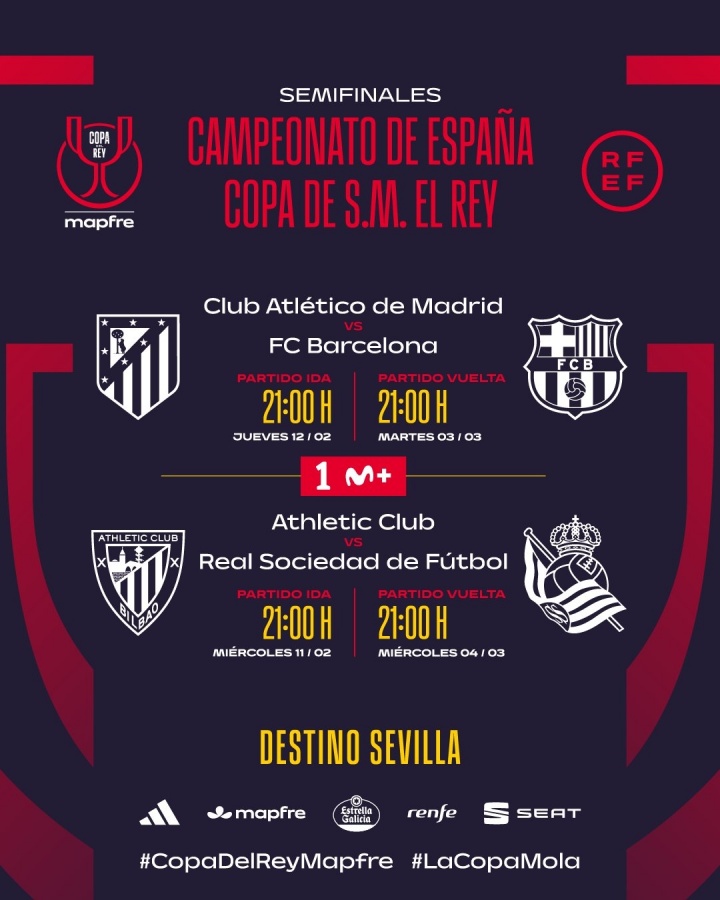 02月06日讯 国王杯半决赛对阵抽签今天进行,最终巴萨遭遇马竞,毕巴将对阵皇社。国王杯半决赛(北京时间)马德里竞技vs巴塞罗那首回合2月13日4:00;次回合3月4日4:00毕尔巴鄂竞技vs皇家社会首回合2月12日4:00;次回合3月5日4:00...