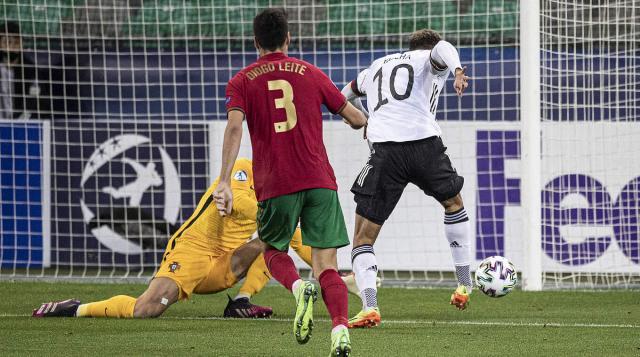 鉴于2比1淘汰荷兰一战是本届德国U21队的最佳比赛,昆茨自然没有必要对首发阵容作出任何调整。维尔茨与巴库这两位大国脚继续在右路形成合力。尽管维尔茨无法复制上一场的神奇表演,巴库的发挥却更上一层楼。第20分钟,他就在右肋送出妙传,帮助恩梅沙反越位直面门将迪奥戈·科斯塔,可惜恩梅沙的右脚搓射被对方一手拍出了底线。